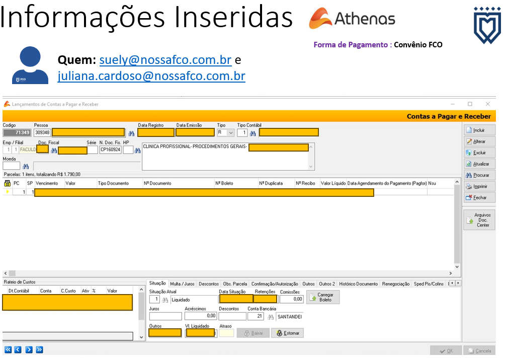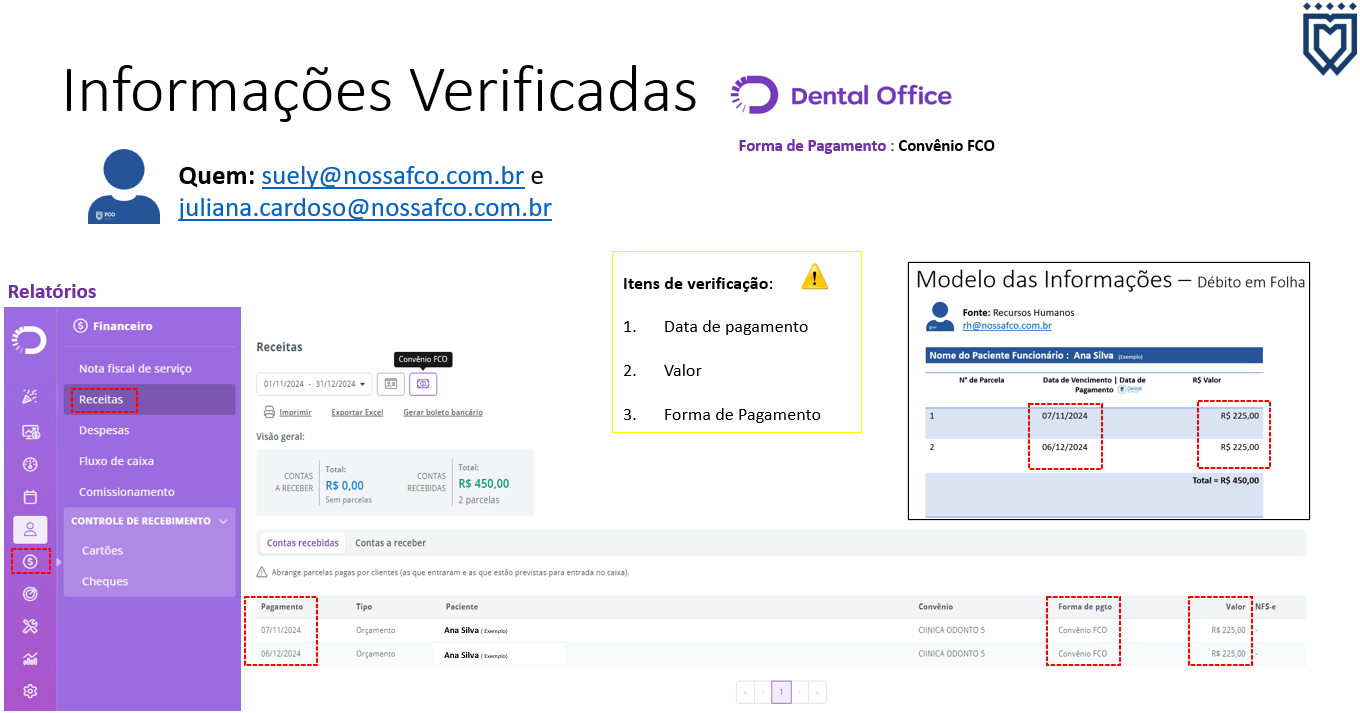 O setor financeiro confere as informações e realiza o lançamento no sistema como 'Lançamento de Contas a Receber'. Esse procedimento é feito mensalmente no centro de custo da Odonto5.