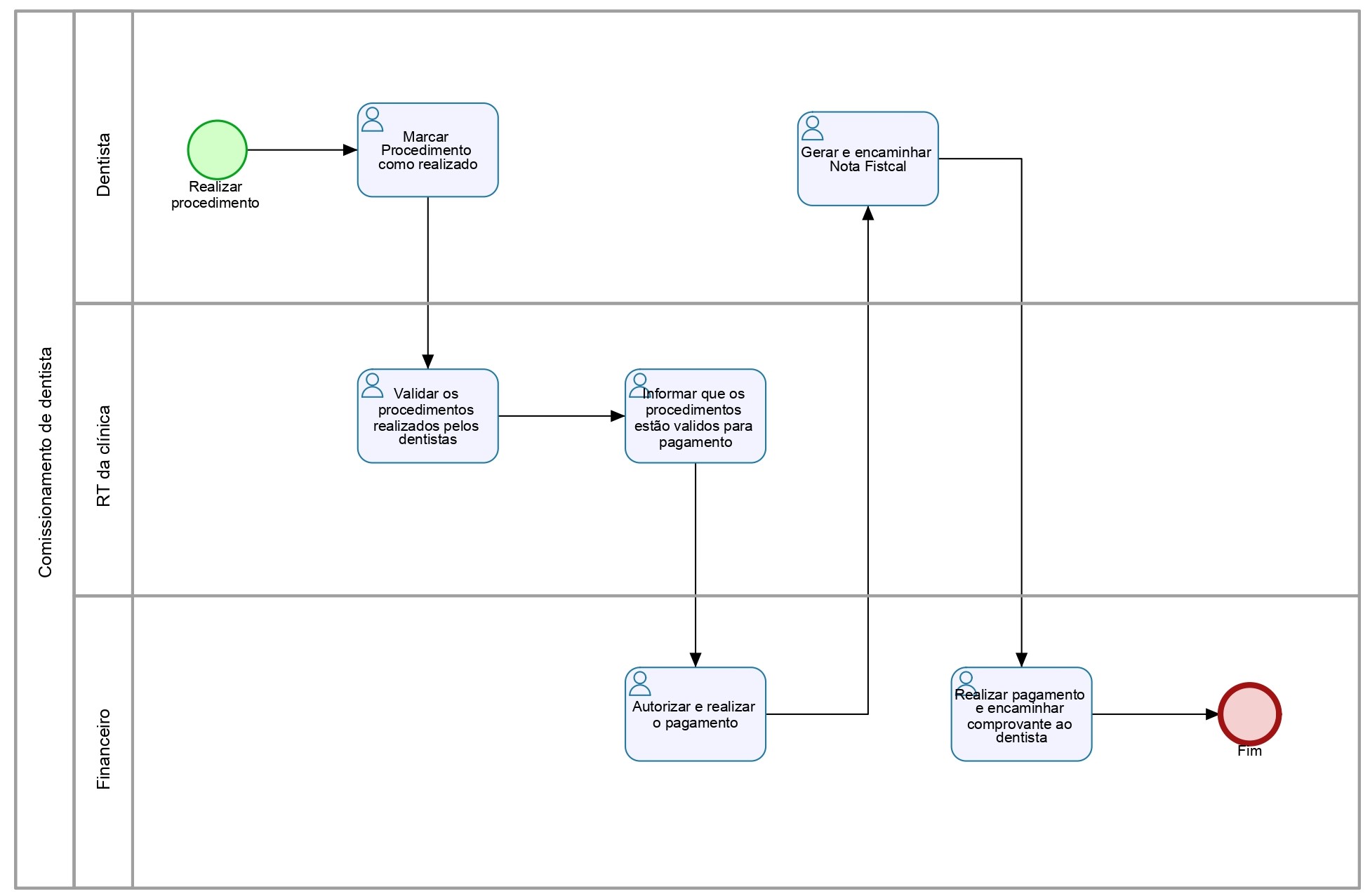- Emitir relatório e comunicar o dentista solicitando a Nota Fiscal.